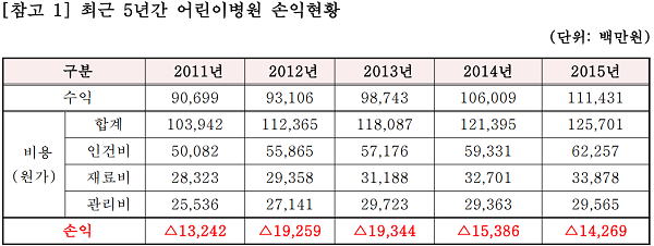 국회 교육문화체육관광위원회 김석기 의원(새누리당)에 따르면 서울대 어린이병원 적자 규모가 지난 5년 간 815억원 수준이며, 연평균 160억원 이상 손해를 보고 있는 상황이다.