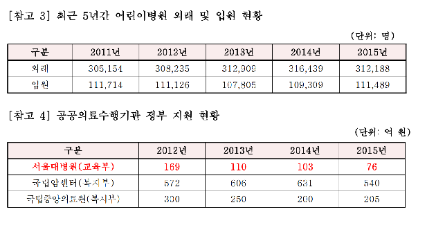 2015년 기준 보건복지부는 국립암센터와 국립중앙의료원에 각각 540억, 25억원을 205억원을 지원한 반면 서울대 어린이병원에는 76억원을 지원했다. 정부 지원의 형평성이 지적받는 대목이다.