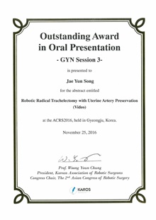 고대 안암병원 송재윤 교수(산부인과)가 '2016 아시아외과로봇수술학회'에서 최우수상을 수상했다.
