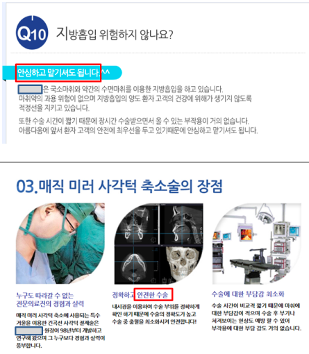 복지부는 "시술의 안전성만 표현하거나 시술 관련 과다 출혈 등 심각한 부작용을 안내하지 않은 경우, 또 부작용을 의무형으로 표현한 경우 등 위법소지가 상대적으로 높은 광고를 집중적으로 점검해 나갈 예정"이라고 밝혔다.